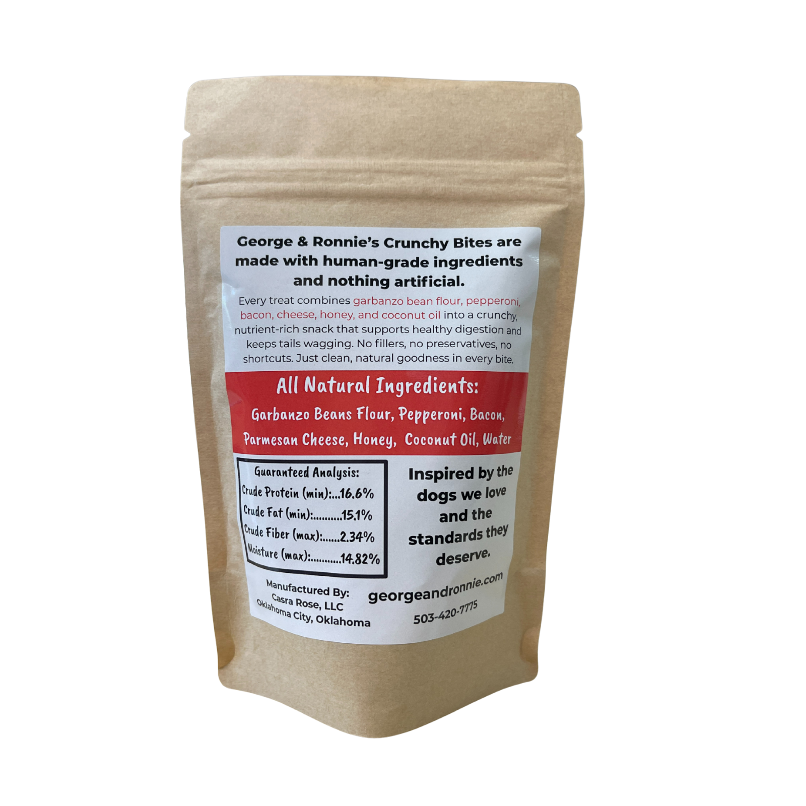 At George & Ronnie’s Dog Treats, we believe every dog deserves a snack that’s both healthy and satisfying. Our Crunchy Bites – Pepperoni, Bacon & Parmesan Cheese combine the savory flavors dogs crave with simple, wholesome ingredients you can trust. These all-natural, oven-baked treats are made with love in small batches using human-grade ingredients and absolutely nothing artificial.